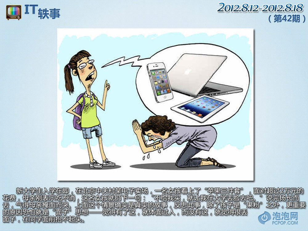 新大学生入学在即,在北京中关村某电子卖场,一名女孩看上了“苹果三件套”,面对超过2万元的花费,母亲刚表示吃不消,这名女孩就扔下一句:“不给我买,就让我在大学丢脸去吧。”说完扬长而去,气得母亲掩面而哭。上面这个情景确实是真实的故事,反思此事,除了孩子是“果粉”之外,更重要的原因恐怕就是“面子”思想——觉得有了这,就体面过人,而没有这,就觉得很丢面子,在同学面前抬不起头。10/12