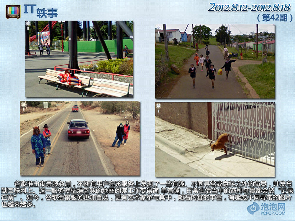 谷歌推出街景服务后,不断有用户在该服务上发现了一些有趣、不同寻常或意料之外的街景,并发布到互联网上。这一服务使枯燥乏味的地图阅读工作变得简 单有趣,日常生活当中的各种奇景都会被“记录在案”。如今,谷歌街景服务更加普及,更有艺术家参与其中,随着内容的丰富,有趣或不同寻常的图片也越来越多。11/12