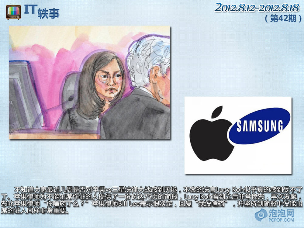 不知道大家最近几周是否对苹果vs三星法律大战感到厌倦,本案的法官Lucy Koh似乎真的感到受不了了。苹果律师为不能出席作证的人提供了一份长达75页的简报,Lucy Koh看到之后非常愤怒,再次发飙,怒叱苹果律师“你嗑药了么?”苹果律师Bill Lee表示很淡定,回复“我没嗑药”,并坚持到简报中没能出席的证人同样非常重要。12/12