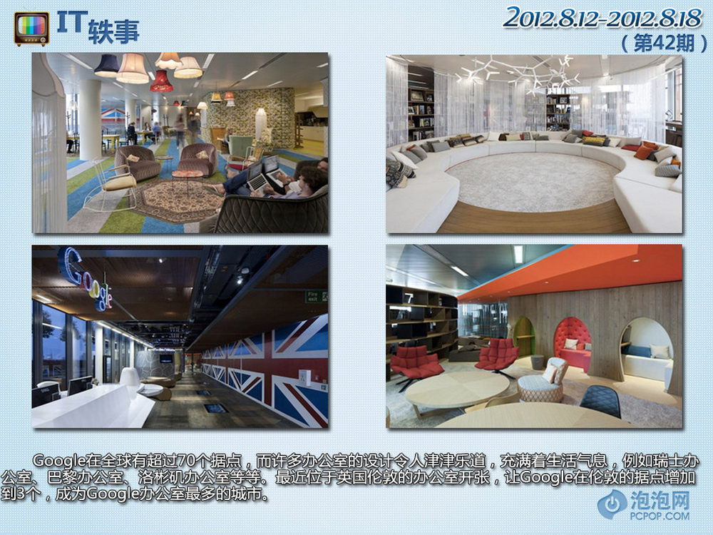 Google在全球有超过70个据点,而许多办公室的设计令人津津乐道,充满着生活气息,例如瑞士办公室、巴黎办公室、洛彬矶办公室等等。最近位于英国伦敦的办公室开张,让Google在伦敦的据点增加到3个,成为Google办公室最多的城市。