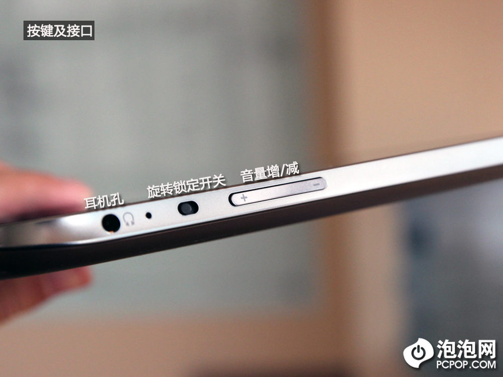 另外在一侧的边框上还拥有耳机孔、旋转锁定开关以及音量增/减按键。13/14