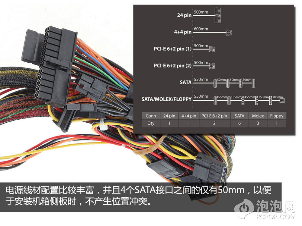 电源线材配置比较丰富,对于两个6 2Pin接头,可以支持较高性能显卡的应用。另外,电源4个SATA线材长度,有了特别的改进,接头之间的长度被缩短至50mm,这样就可以避免安装侧板时,会不产生线材与侧板的位置冲突。7/15