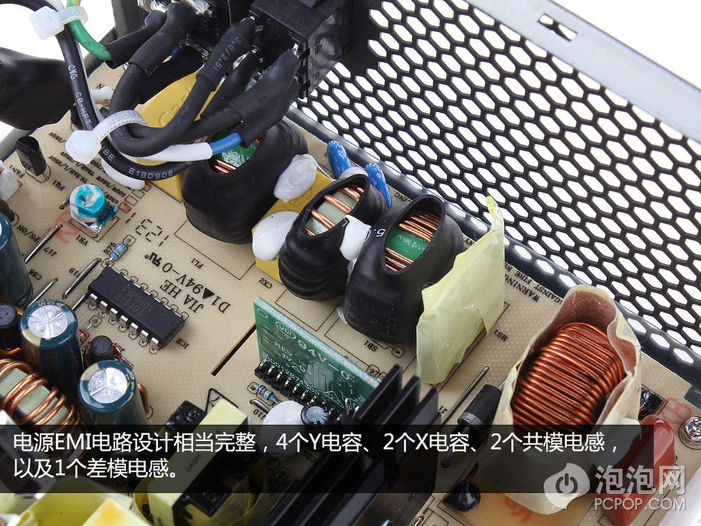 虽然电源内部电路看上去比较清爽,但是EMI滤波电路并没有偷工减料。4个Y电容,2个X电容,2个共模电感,以及1个差模电感,EMI电路非常完善。9/15