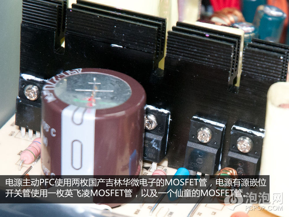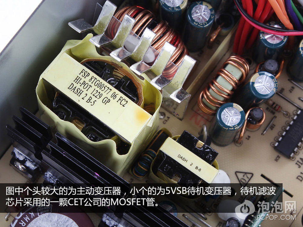 电源主变压负载将高压电转为低压12V。另外,5VSB待机电路的滤波芯片采用了一枚CET的MOSFET管,贴在散热片上。14/15