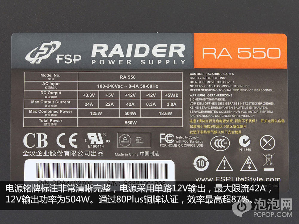 电源铭牌标注比较清晰明确,可以看出电源的额定功率为550W,采用单路12V输出,最大限流为42A,12V最大输出功率为504W。电源通过了80Plus的铜牌认证,官方称最高效率超过了87%%,不过根据我们对这款电源的初步测试之后,发现这款电源的转换效率接近金牌水平。而具体的性能测试,我们将在后续的文章中为大家介绍。6/15