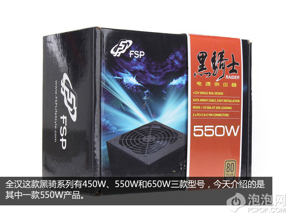 相较于以往的包装护设计,这款电源的包装更为风格化一些。不过包装上的信息还是比较清晰、丰富。另外黑骑士电源系列包括:450W、550W和650W,三款型号。3/15