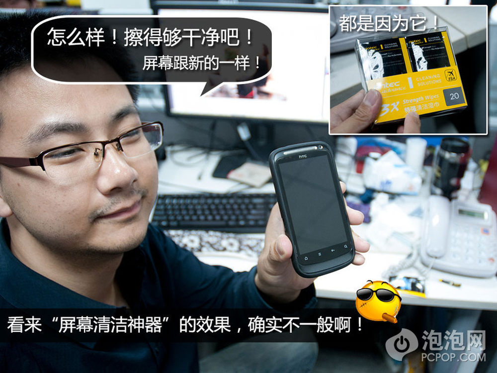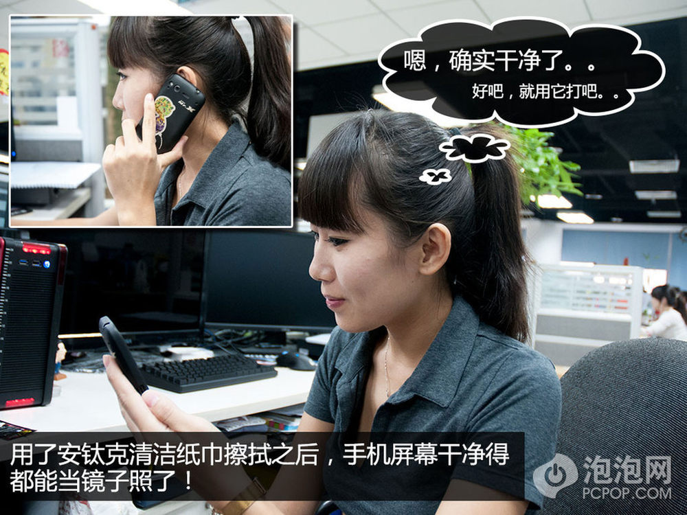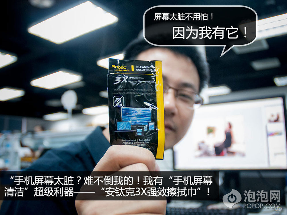 其实正中下怀,我们的“男猪脚”掏出一个样东西。细细一看,原来是安钛克最近引入大陆销售的“手机屏幕清洁纸巾”——3X强效擦拭巾。8/24