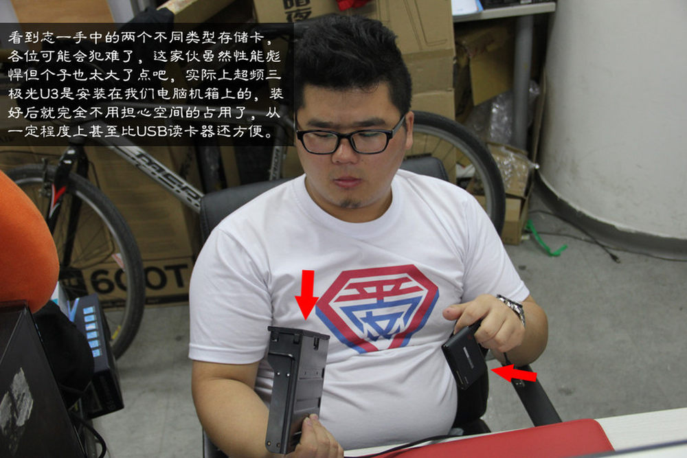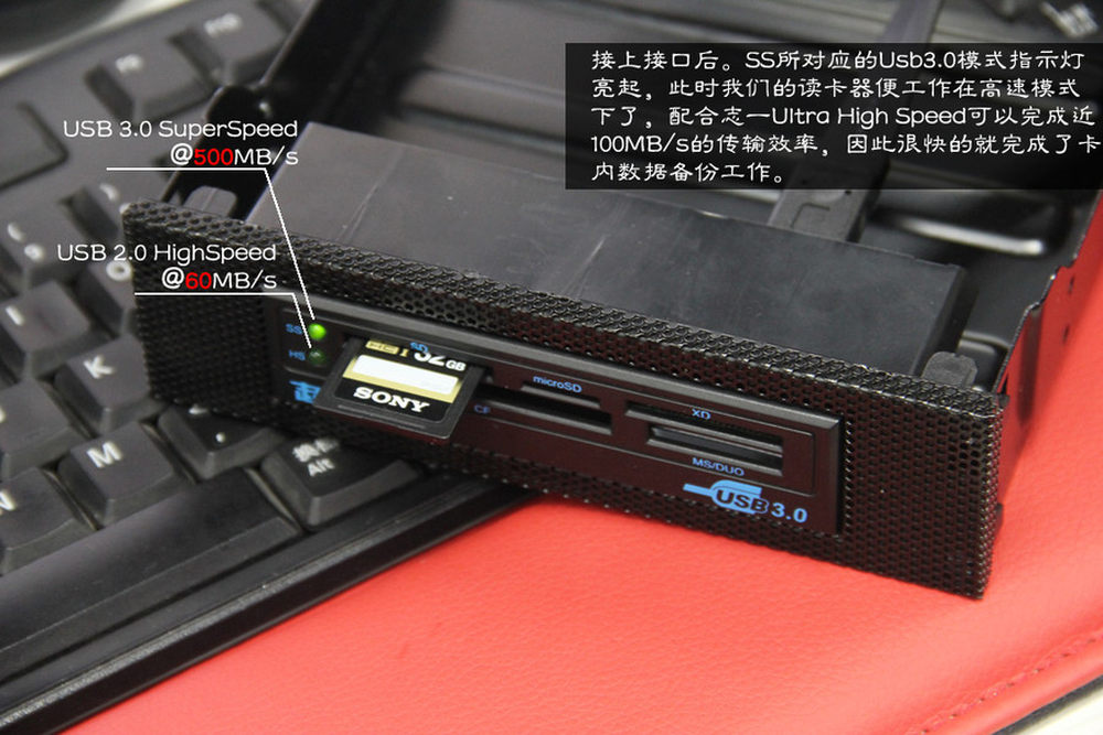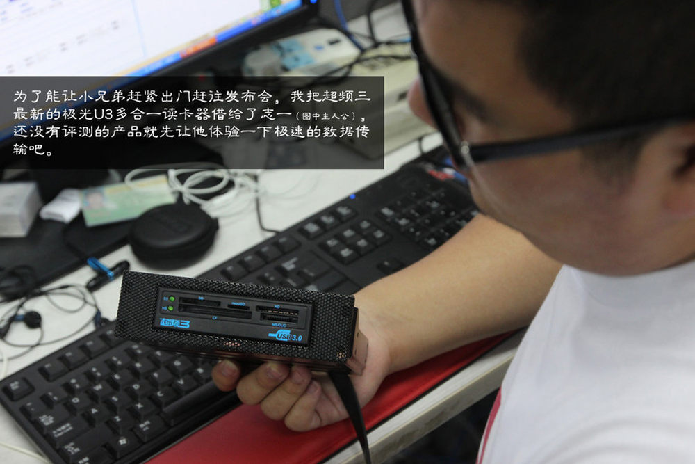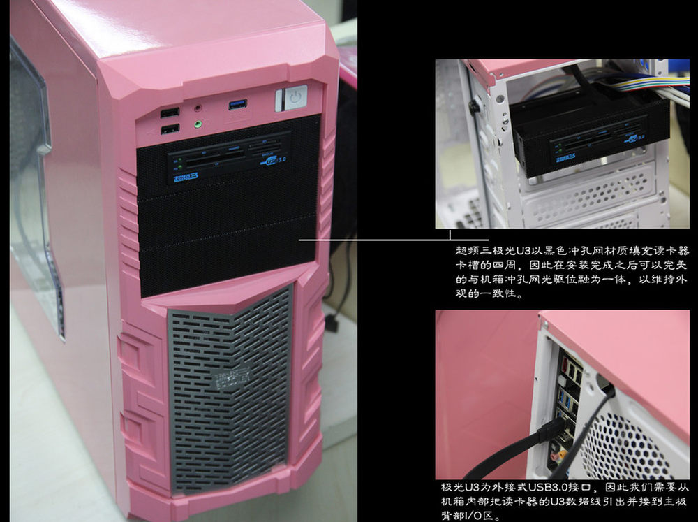 除了刚刚介绍的极光U3读卡器,超频三还为大家带来了一款U3集线器,通过内接式U3针脚提供两个USB3.0接口,如果大家机箱还没有U3的话将是不错的选择。出U3扩展功能外,超频三两款U3家族的新品都能固定一块SSD,放在光驱面板上可以释放更多的硬盘仓。16/17