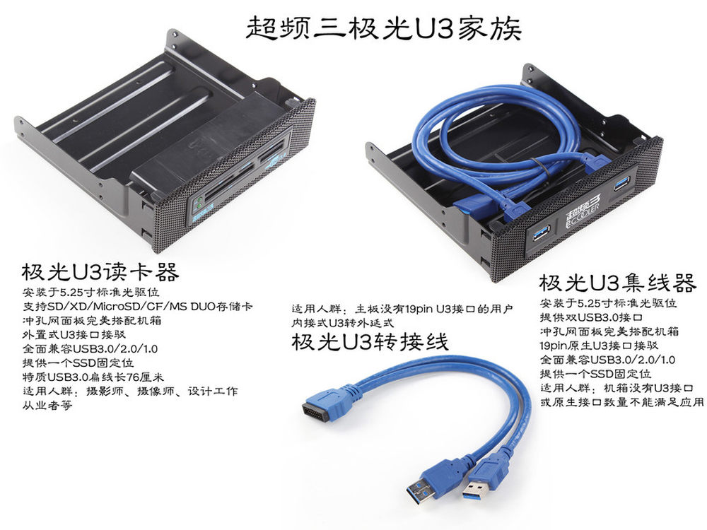 近一年来,主板以及机箱都有一个共同且明显的变化,那就是USB3.0这个接口已经成为了绝对标配,USB3.0的诞生至今时间并不算短,至今才是走向主流的最佳时节,为此也有各种扩展周边相继面世,今天为各位介绍的超频三U3家族便是非常实用的小配件,下面为大家带来试用体验。2/17