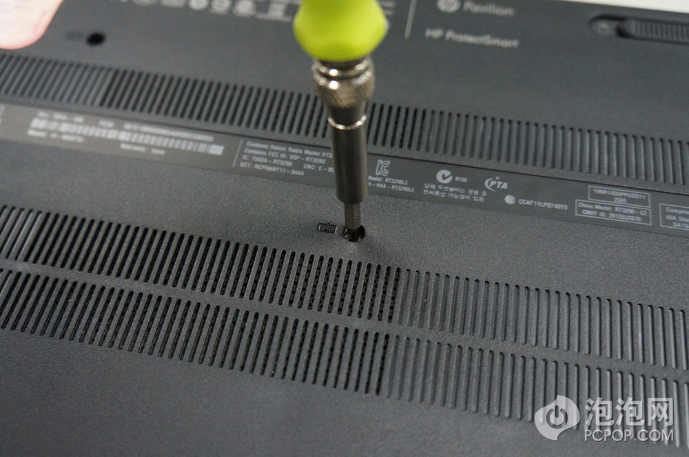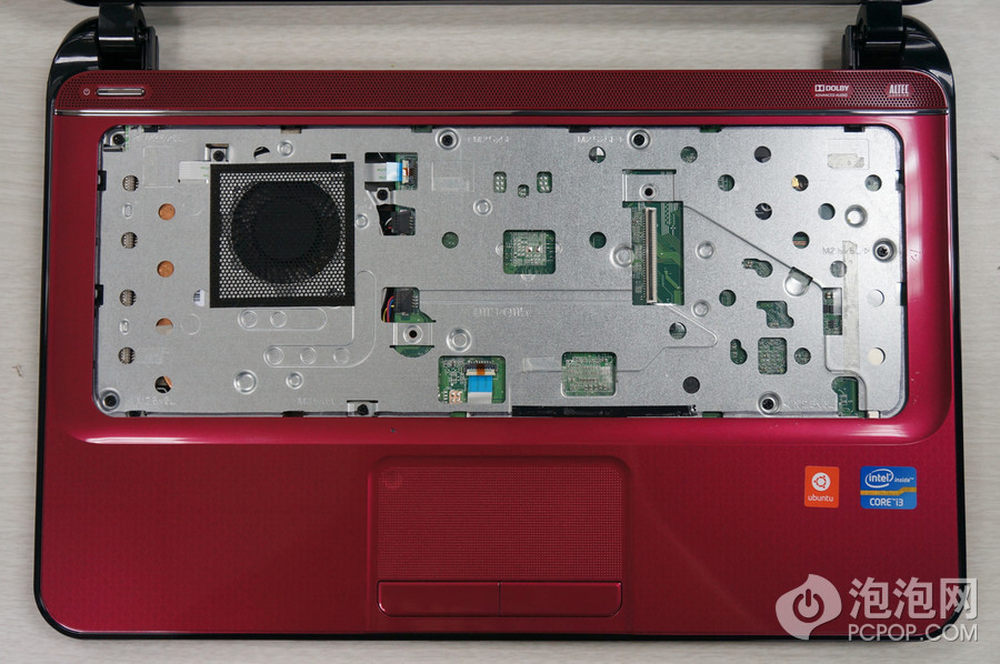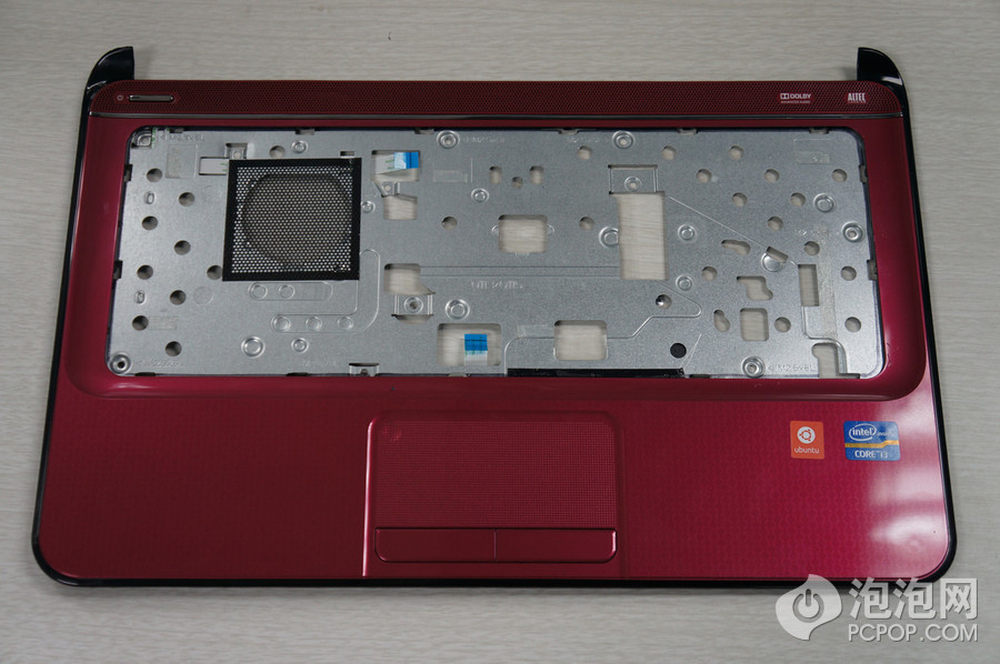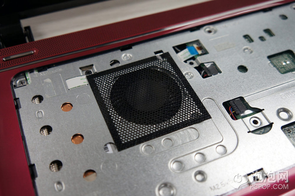 惠普Pavilion 14超极本在散热方面非常出色,在铝板上,我们发现一个蜂窝状的网膜附在风扇位置的上面,一方面可以均匀进风,另一方面也让防止灰尘的进到风扇中。11/31