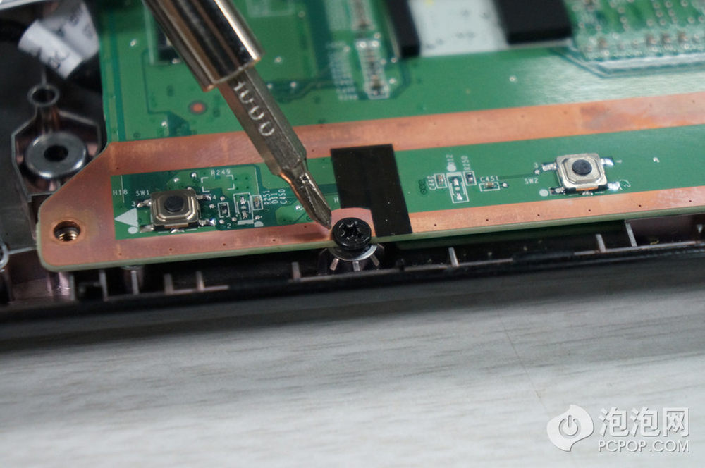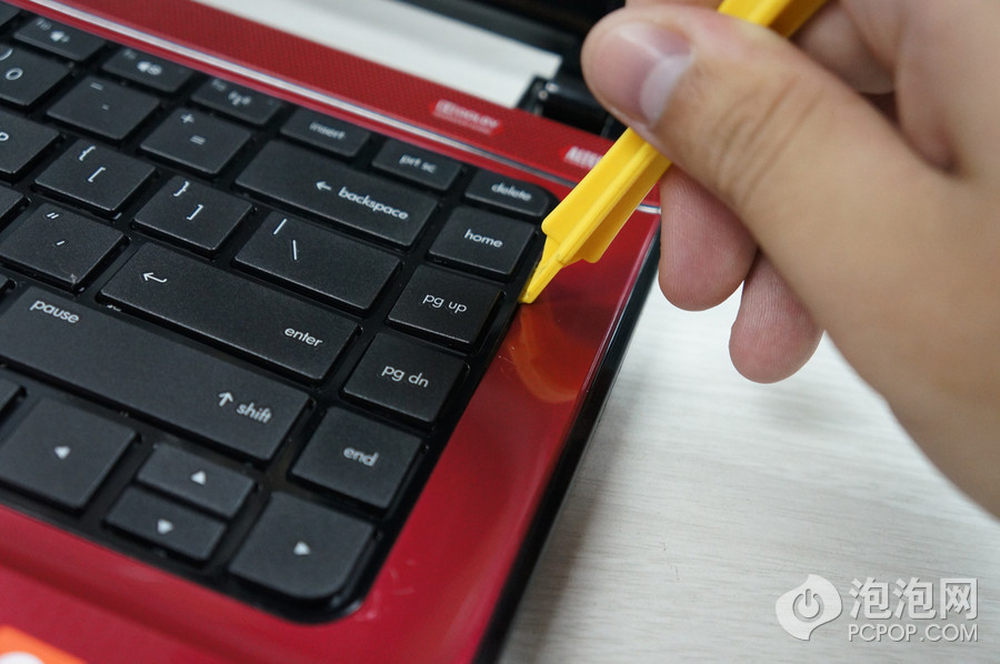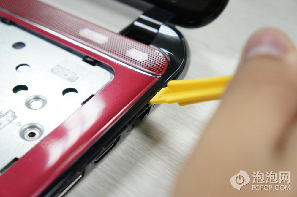 这款超级本比较难拆,我们在拧下D面螺丝后需要用撬边工具把键盘取下来。不过键盘的卡扣不太容易找到,要顺着边缘慢慢进行,用力也要适中,这个过程需要非常谨慎。