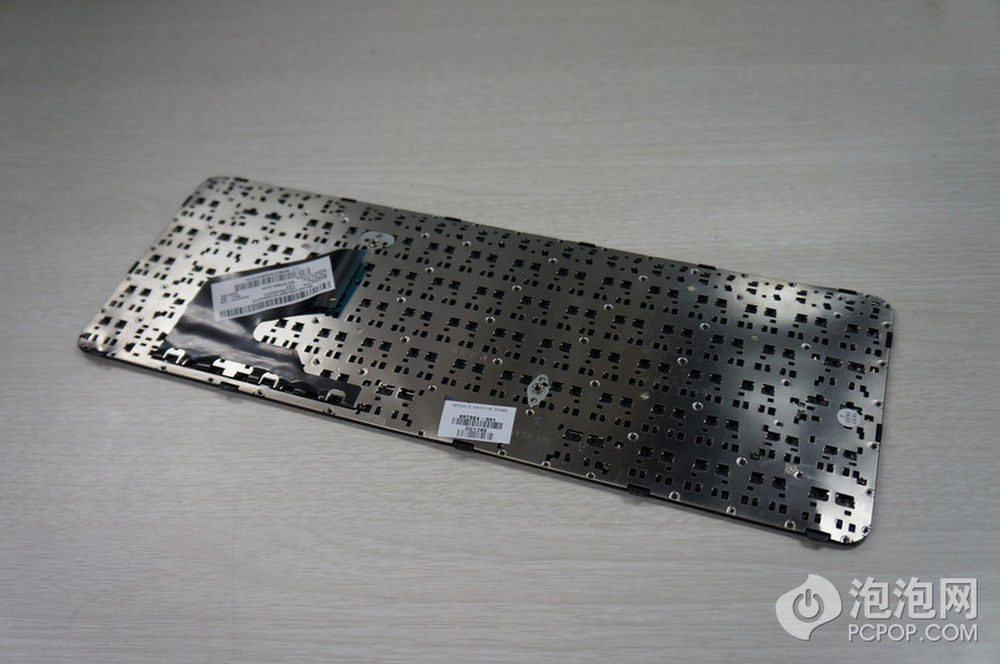键盘被拆卸下来后,可以看到与主板之间是一层铝制盖板,而盖板与主板之间仍然是通过10颗四角螺丝固定。铝板主要是起着稳定键盘并保护主板的作用,让用户在敲击时不会产生颤动。