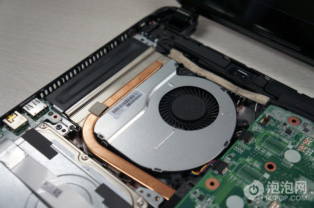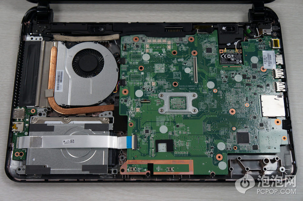 取下C面之后,就可以看到惠普Pavilion 14的内部全貌了,从这张图上可以看到HDD机械硬盘和散热风扇被设计在左侧,而CPU在正中央的位置,内存和SSD固态硬盘在CPU的旁边。15/31