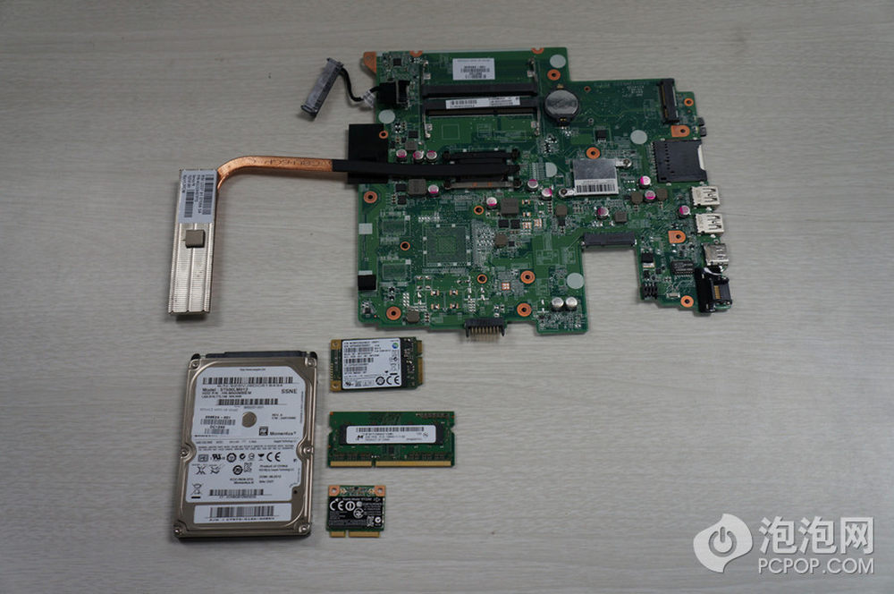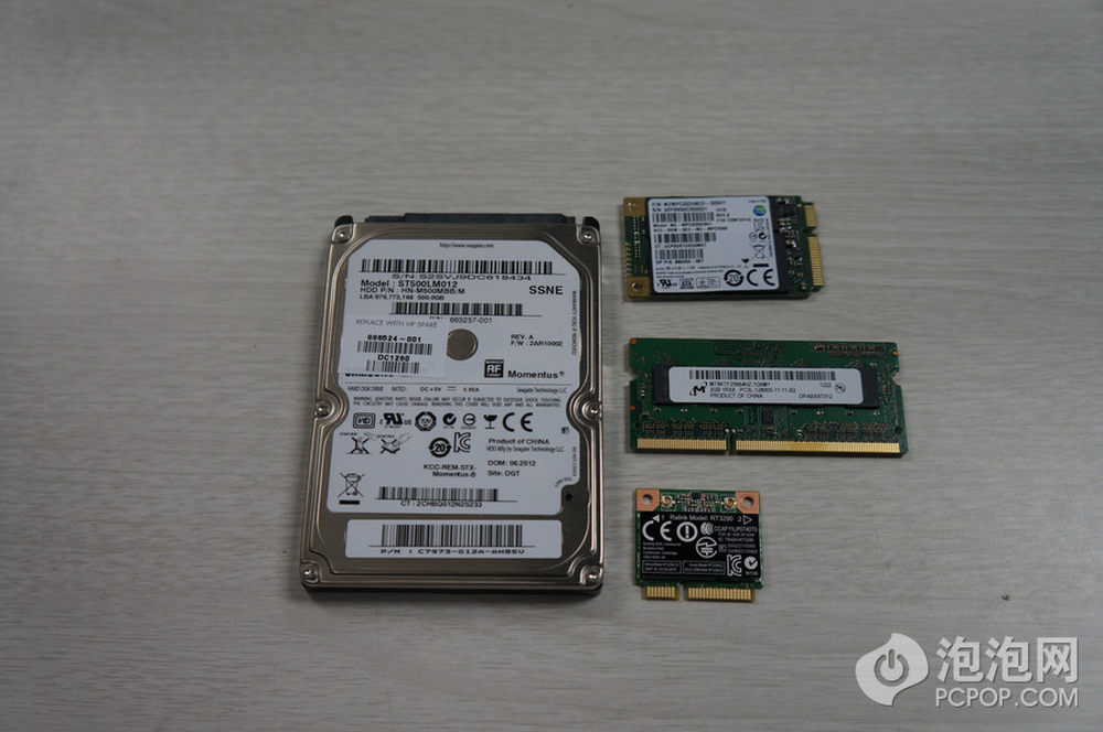 该机的配件特写,分别是HDD机械硬盘、SSD固态硬盘、内存、无线网卡。23/31