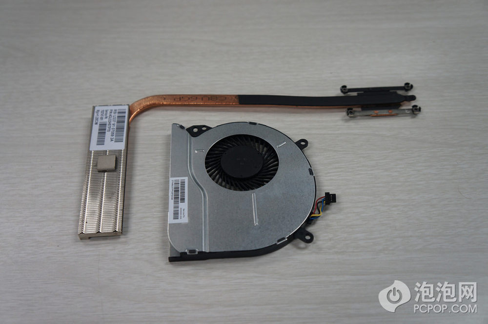 整个散热模块由散热铜管、散热鳍片、风扇组成,铜质导热管在延伸至处理器的部分进行了绝缘处理,并在靠近出风口的散热片上附上了一层绝缘贴膜。