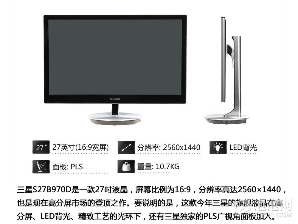 三星S27B970D是一款27吋液晶,屏幕比例为16:9,分辨率高达2560*1440,也是现在高分屏市场的登顶之作。要说明的是,这款今年三星的旗舰液晶在高分屏、LED背光、精致工艺的光环下,还有三星独家的PLS广视角面板加入。3/16