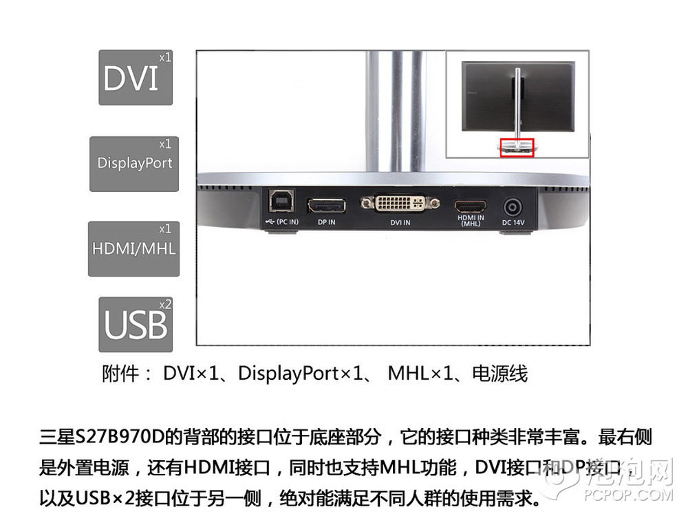 三星S27B970D的背部的接口位于底座部分,它的接口种类非常丰富。最右侧是外置电源,还有HDMI接口,同时也支持MHL功能,DVI接口和DP接口,以及USB*2接口位于另一侧,绝对能满足不同人群的使用需求。4/16