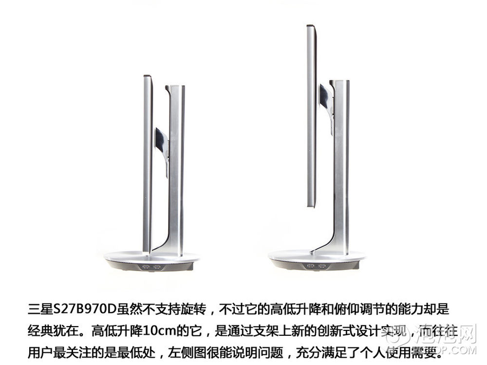 三星S27B970D虽然不支持旋转,不过它的高低升降和俯仰调节的能力却是经典犹在。高低升降10cm的它,是通过支架上新的创新式设计实现,而往往用户最关注的是最低处,左侧图很能说明问题,充分满足了个人使用需要。5/16