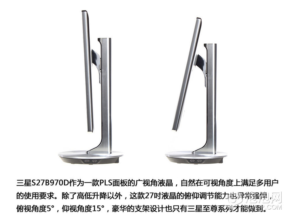 三星S27B970D作为一款PLS面板的广视角液晶,自然在可视角度上满足多用户的使用要求。除了高低升降以外,这款27吋液晶的俯仰调节能力也异常强悍,