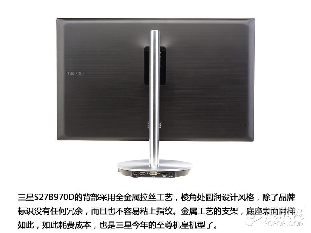 三星S27B970D的背部采用全金属拉丝工艺,棱角处圆润设计风格,除了品牌标识没有任何冗余,而且也不容易粘上指纹。金属工艺的支架,底座表面同样如此,如此耗费成本,也只有三星的至尊机皇了。7/16