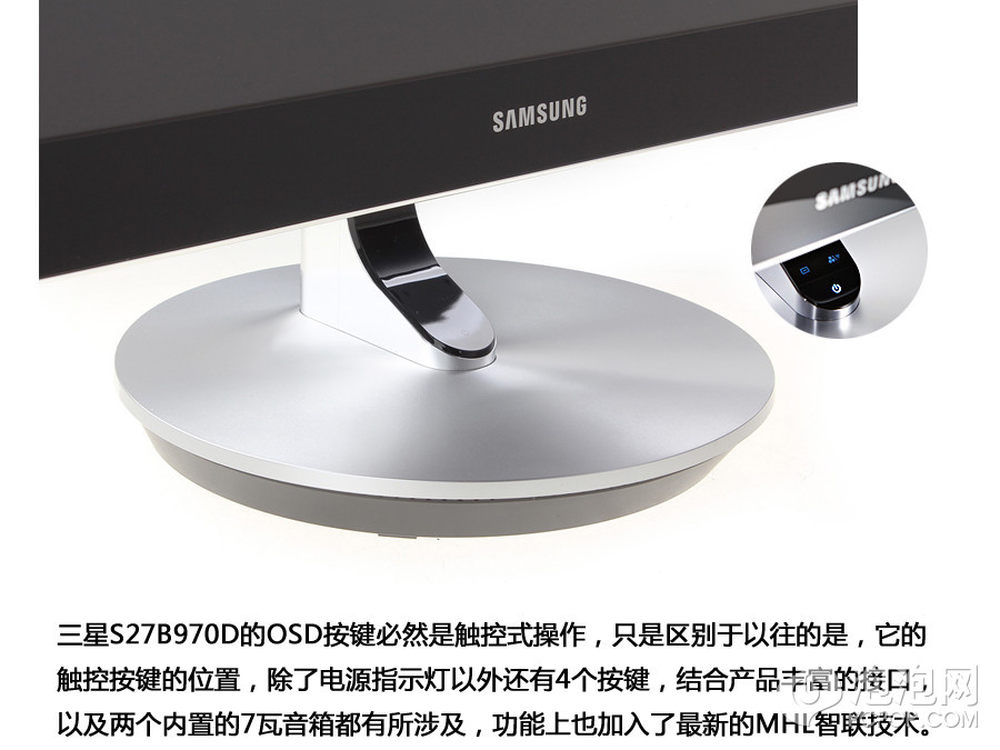 三星S27B970D的OSD按键必然是触控式操作,只是区别于以往的是,它的触控按键的位置,不仅美观实用还不在使用液晶时感到有丝毫冗余。除了电源指示灯以外还有4个按键,结合产品丰富的接口,以及两个内置的7瓦音箱都有所涉及,功能上也加入了最新的MHL智联技术。9/16