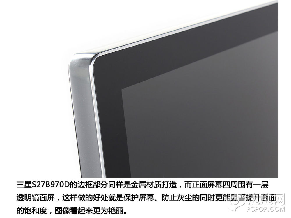 三星S27B970D的边框部分同样是金属材质打造,而正面屏幕四周围有一层透明镜面屏,这样做的好处就是保护屏幕、防止灰尘的同时更能显著提升画面的饱和度,图像看起来更为艳丽。8/16