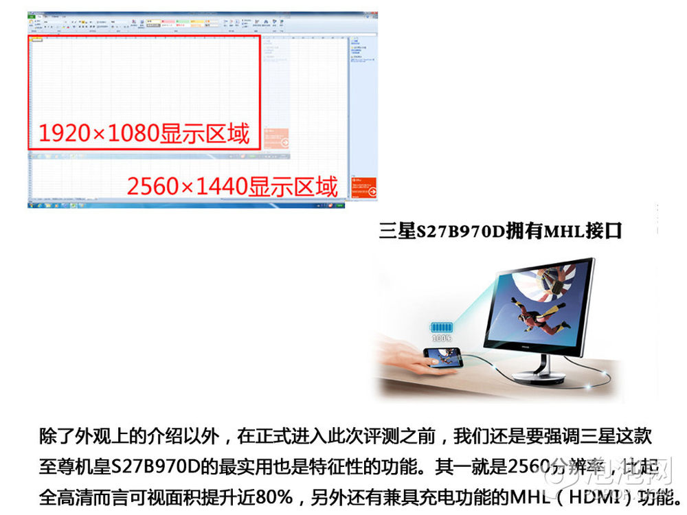 除了外观上的介绍以外,在正式进入此次评测之前,我们还是要强调三星这款至尊机皇S27B970D的最实用也是特征性的功能。其一就是2560分辨率,比起全高清而言可视面积提升近80%%,另外还有兼具充电功能的MHL(HDMI)功能。10/16