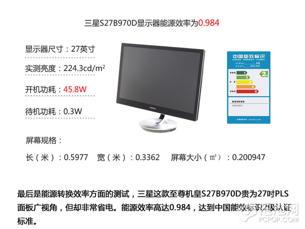 最后是能源转换效率方面的测试,三星这款至尊机皇S27B970D贵为27吋PLS面板广视角,但却非常省电。能源效率高达0.984,达到中国能效标识2级认证