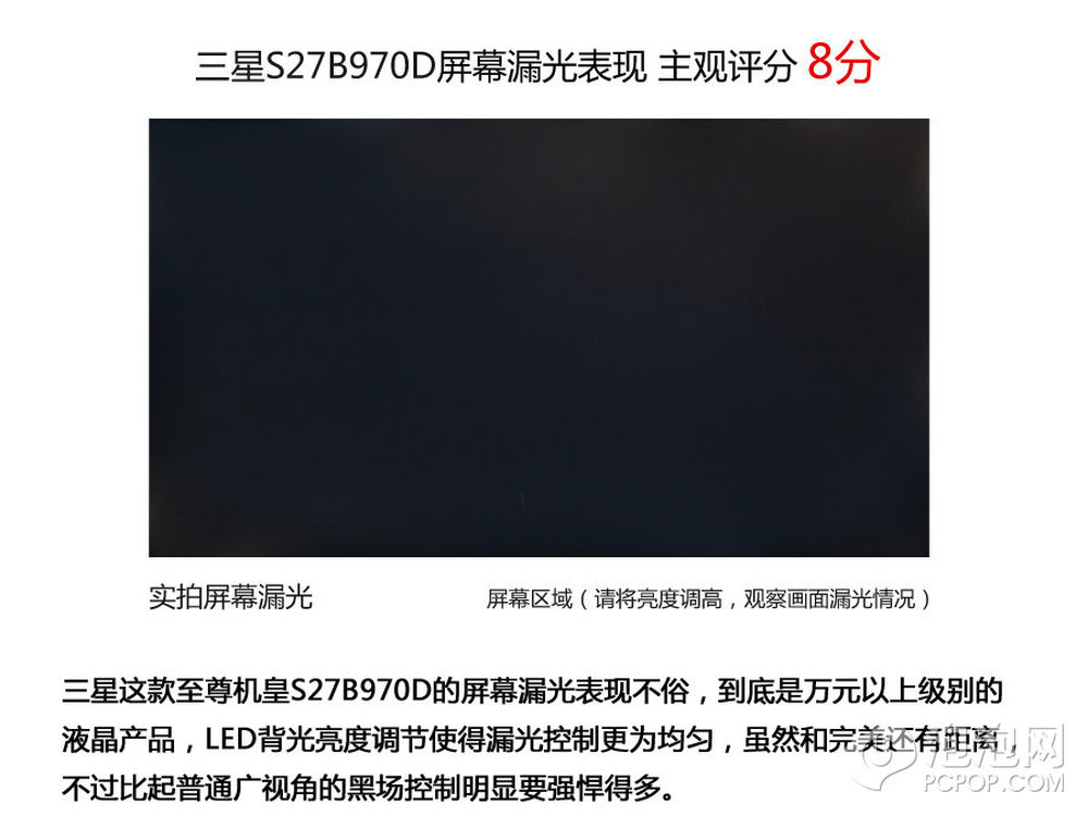 三星这款至尊机皇S27B970D的屏幕漏光表现不俗,到底是万元以上级别的液晶产品,LED背光亮度调节使得漏光控制更为均匀,虽然和完美还有距离,不过比起普通广视角的黑场控制明显要强悍得多。16/16