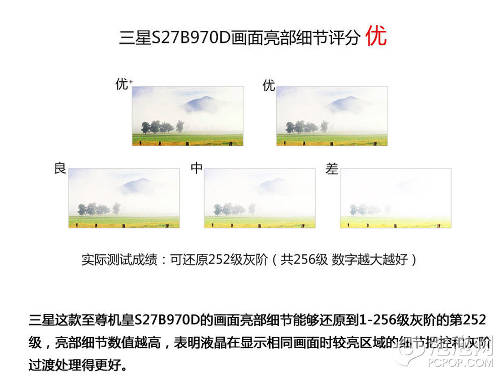 三星这款至尊机皇S27B970D的画面亮部细节能够还原到1-256级灰阶的第252级,亮部细节数值越高,表明液晶在显示相同画面时较亮区域的细节把控和灰阶过渡处理得更好。13/16