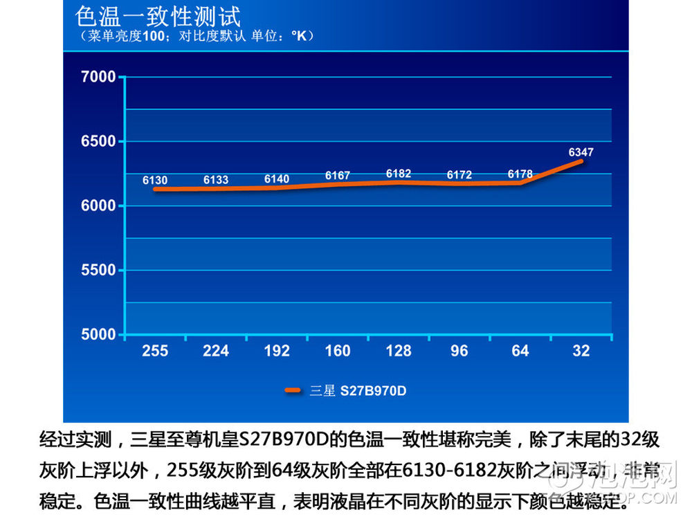 经过实测,三星至尊机皇S27B970D的色温一致性堪称完美,除了末尾的32级灰阶上浮以外,255级灰阶到64级灰阶全部在6130-6182灰阶之间浮动,非常稳定。色温一致性曲线越平直,表明液晶在不同灰阶的显示下颜色越稳定。14/16