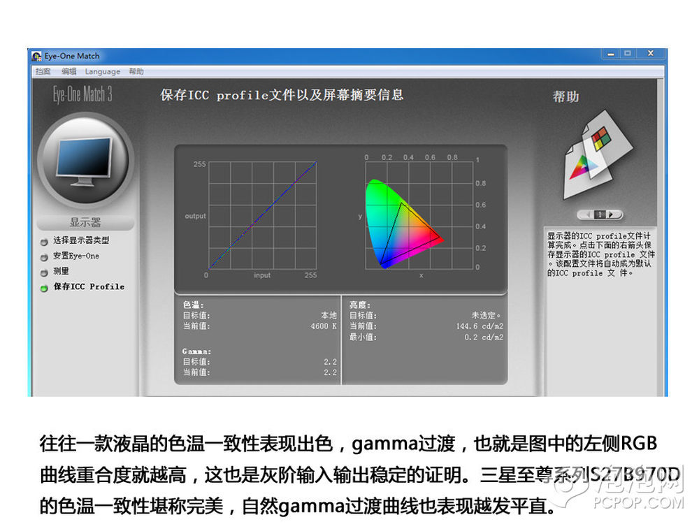 往往一款液晶的色温一致性表现出色,gamma过渡,也就是图中的左侧RGB曲线重合度就越高,这也是灰阶输入输出稳定的证明。三星至尊系列S27B970D的色温一致性堪称完美,自然gamma过渡曲线也表现越发平直。15/16