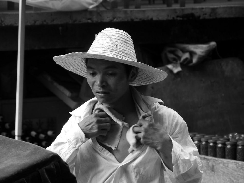 我们要想到的拍摄龙脊梯田的最佳拍摄地,首先需要攀登一段较长的山路。而路边的一个卖壮族服装的摊子吸引了我的主意,五颜六色的壮族服装在松下G5的镜头下,显得格外抢眼。6/21