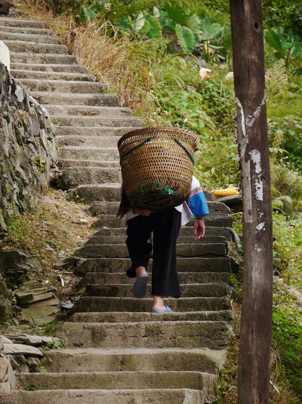 在崎岖的山路上,一位阿婆的身影进入到了我的视线内。山上旅店主要的食物和日用品供应,都是靠人力一个台阶一个台阶的背上去的,真的是太不容易了。11/21