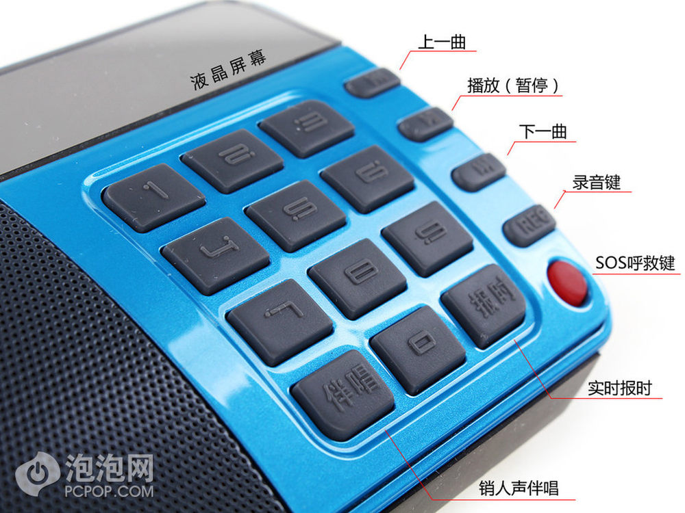 防尘硅胶按键,手感柔软细腻。通过数字按键输入简单的数字,再短按播放键,就能精确的找到歌曲和调频广播电台,仅需1-3秒的时间。短按伴唱键,就能听到销人声伴奏音乐。短按报时键,音箱可以大声准确的报时。短按录音键,可以实现清晰录音功能。