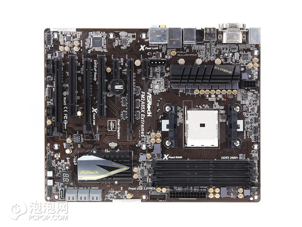 华擎FM2A85X Extreme6主板隶属于华擎的极限玩家系列,它采用了标准ATX板型设计,棕色PCB 黑色插槽 金色固态电容的搭配风格让产品外观在沉稳中又不失亮点。3/14
