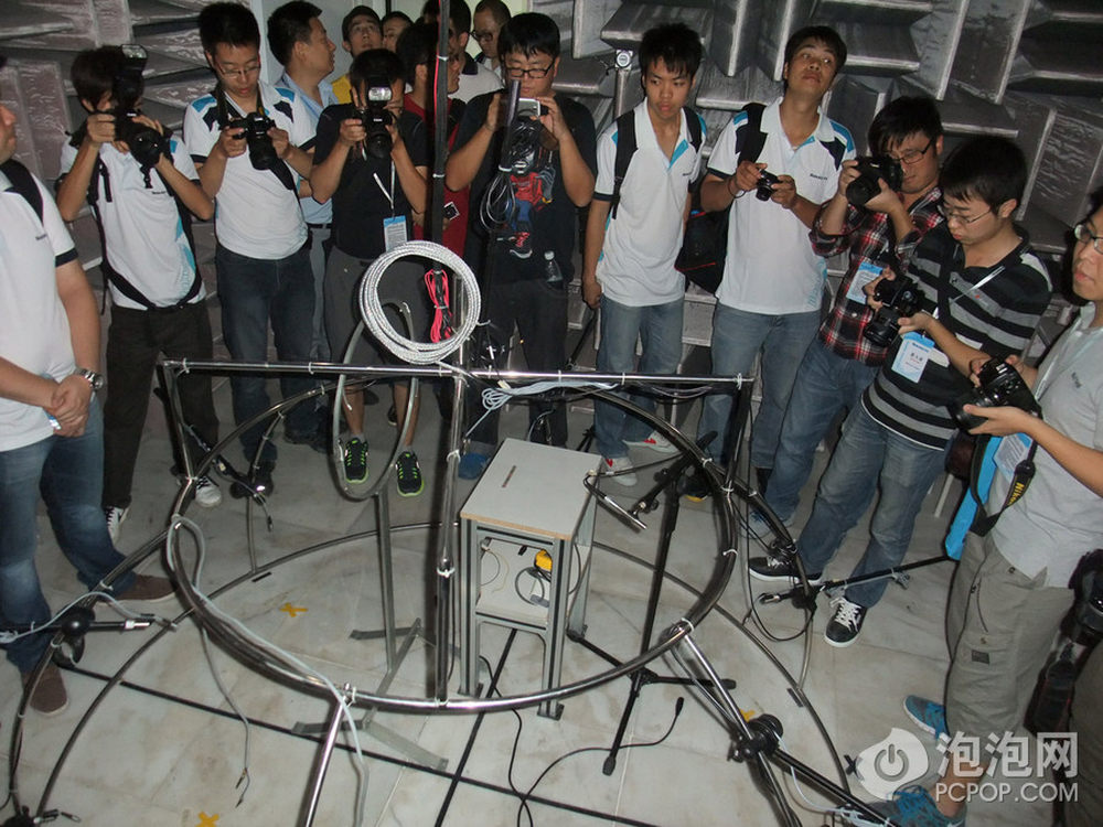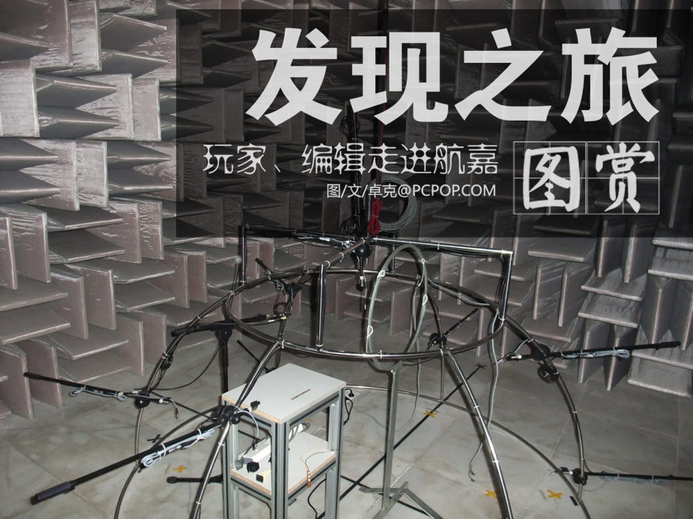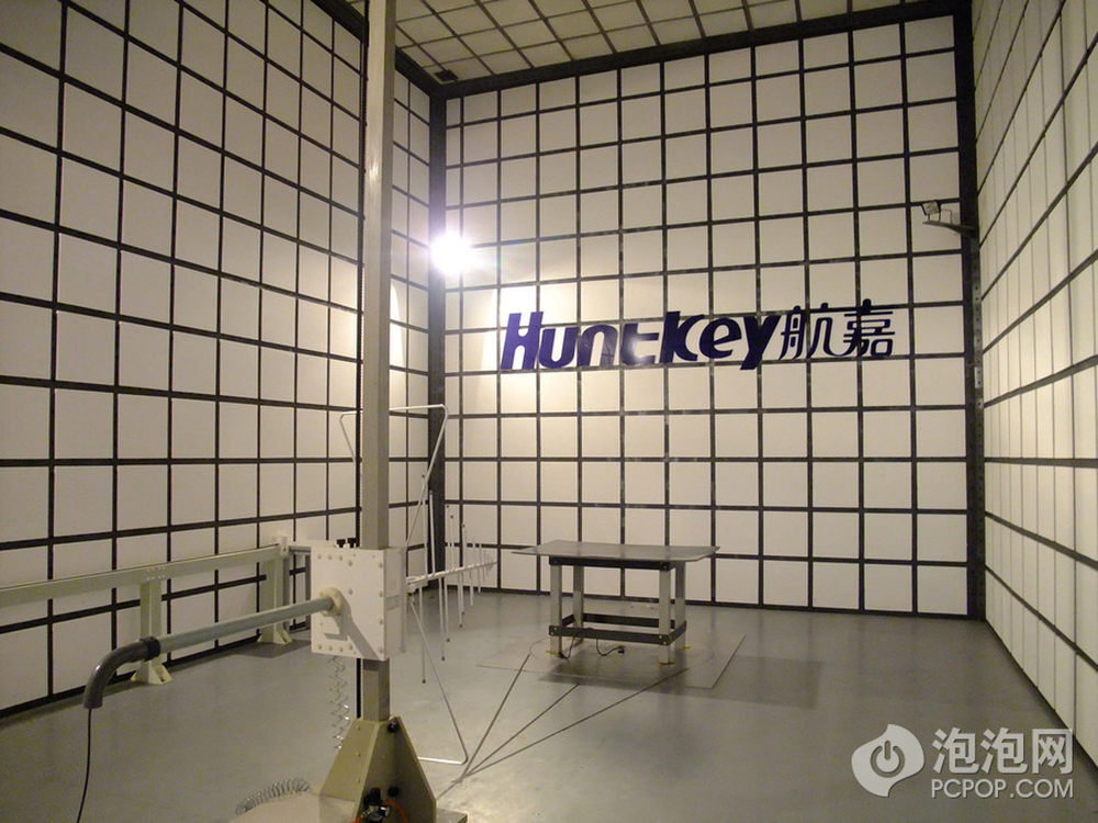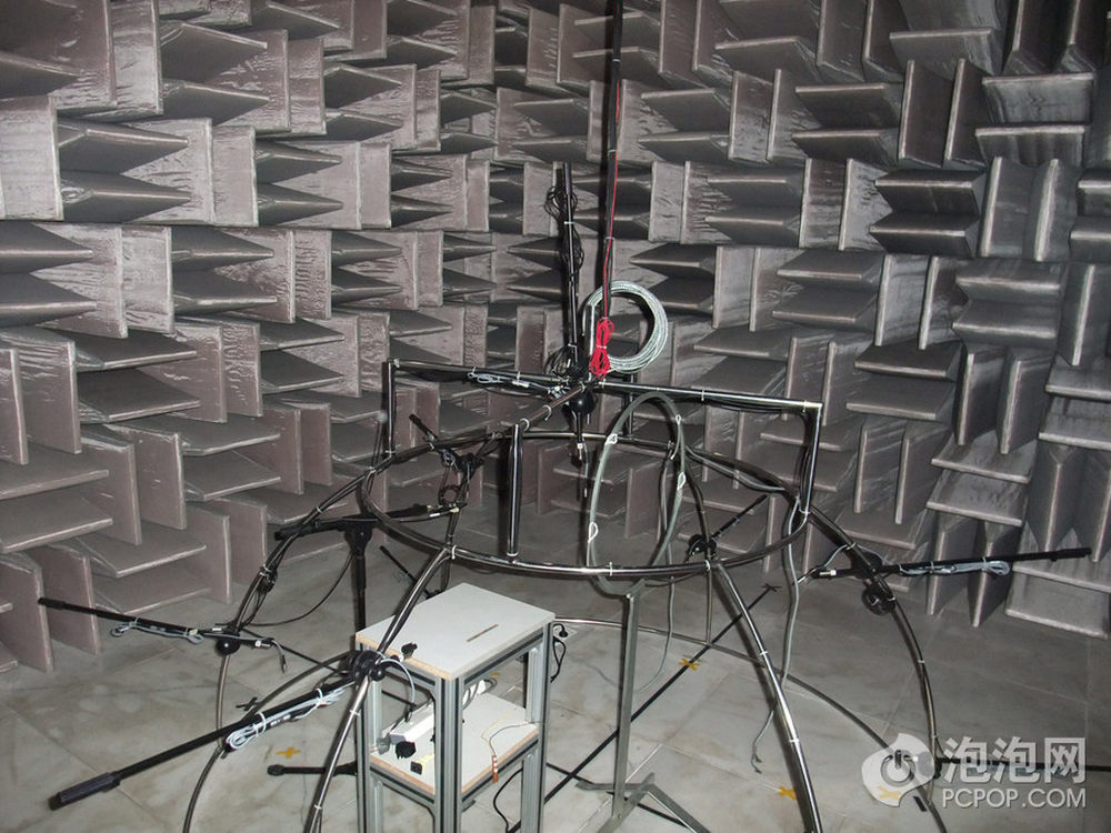 这张图在很多媒体的“机箱、电源横测”中都会出现,这是航嘉的3m半电波暗室,这里创造出一个对电磁波来说近似无限辽阔的区域,这样电磁波在各个方向不会被反射,在提供了这样的环境后我们就可以准确测量某一个方向上测量辐射的大小。不反射电磁波靠的是红框内的铁氧体吸波材质,整间暗室的墙壁全部由这些铁氧体砖块贴满,一块10cm平方,大约6美元。整个暗室造价300万人民币,这还不算那些测试设备。