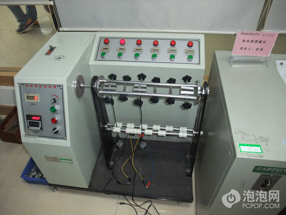 线材接头的摆动测试,大家都知道线材接头部分是最容易损坏的,因为弯折总在这里,所以为了验证可靠性和平均无故障时间,线材的弯折也要用机器模拟。