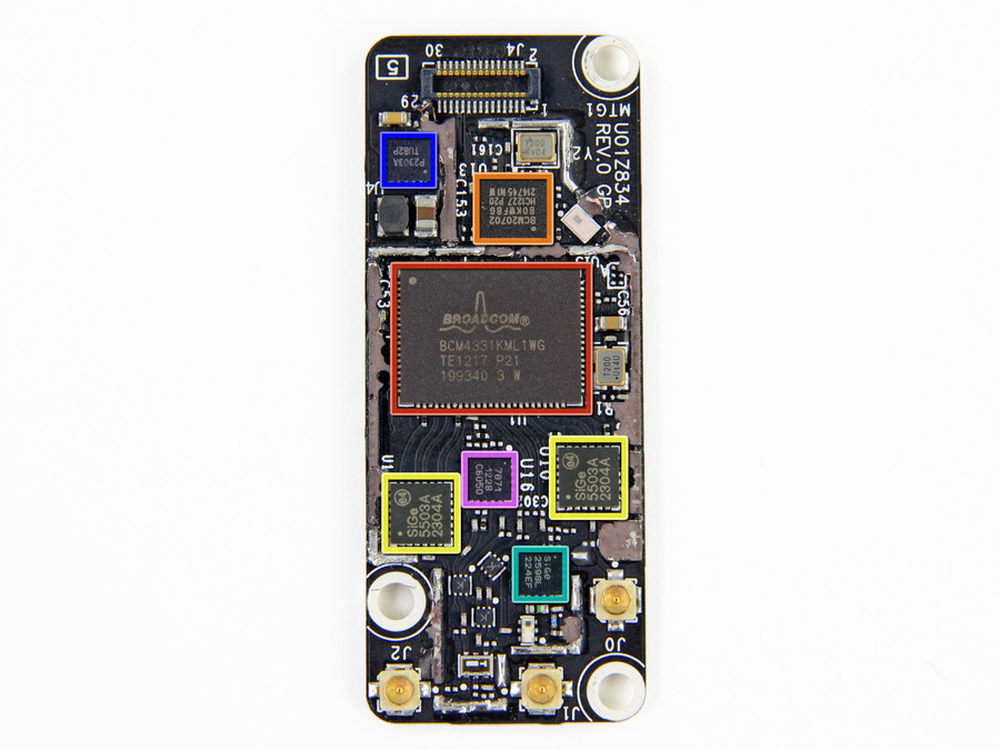 WiFi模块背面,采用了Broadcom的芯片方案,芯片型号为BCM4331KML1WG,另外PCB上还整合了BCM20702蓝牙4.0芯片。23/37