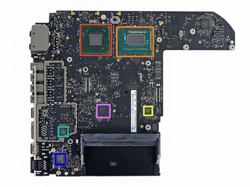 背面芯片相当密集,包括Cirrus Logic 4206B音频控制器、SMSC USB2512B USB 3.0 HUB控制器、BroadcomBCM57765千兆以太网控制器、Intel L232TB45 ThunderBolt雷电控制器。29/37