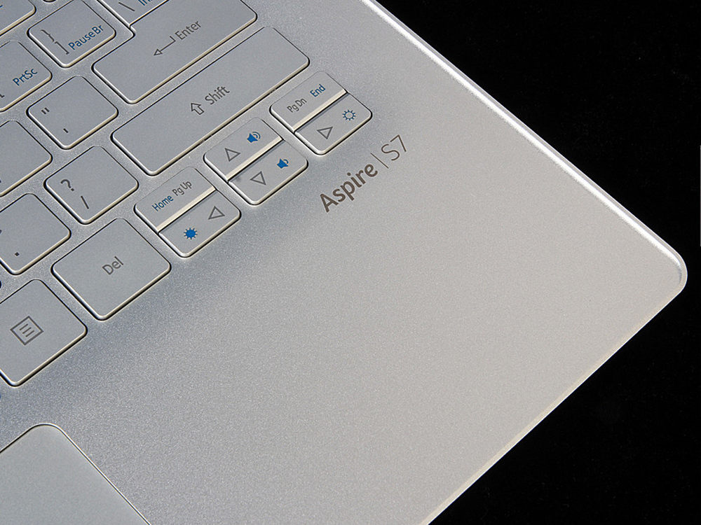 该机C面采用镁铝合金材质打造,质感非常出众。不过由于机身轻薄的缘故,按键键程短的确是Acer S7的一个弊病。Acer S7的键盘带有白色的背光,并可根据环境光自动调节亮度,是比较人性化的的设计,发光均匀,也没有明显漏光现象,还是相当不错的。17/29