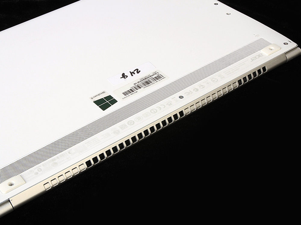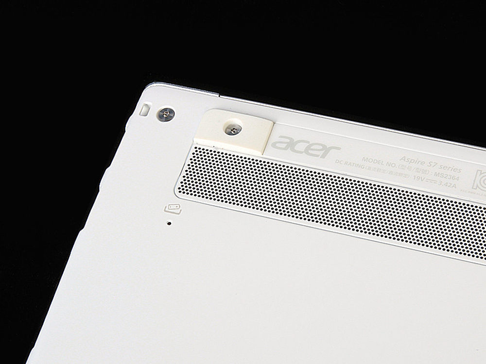 像几乎所有超轻薄的超极本一样,Acer S7也采用了后置散热设计,散热窗被设计在机身底部和转轴后端。23/29