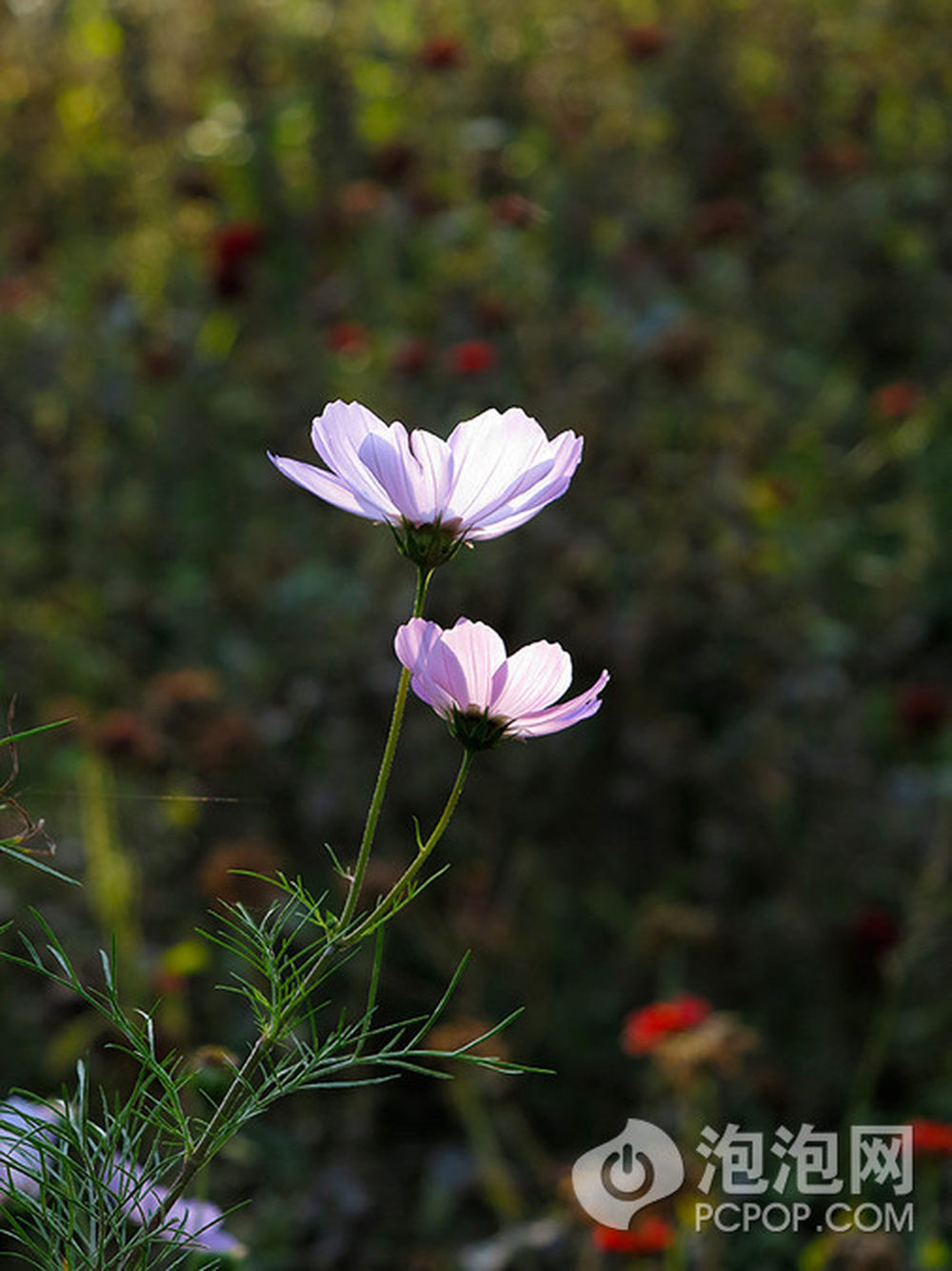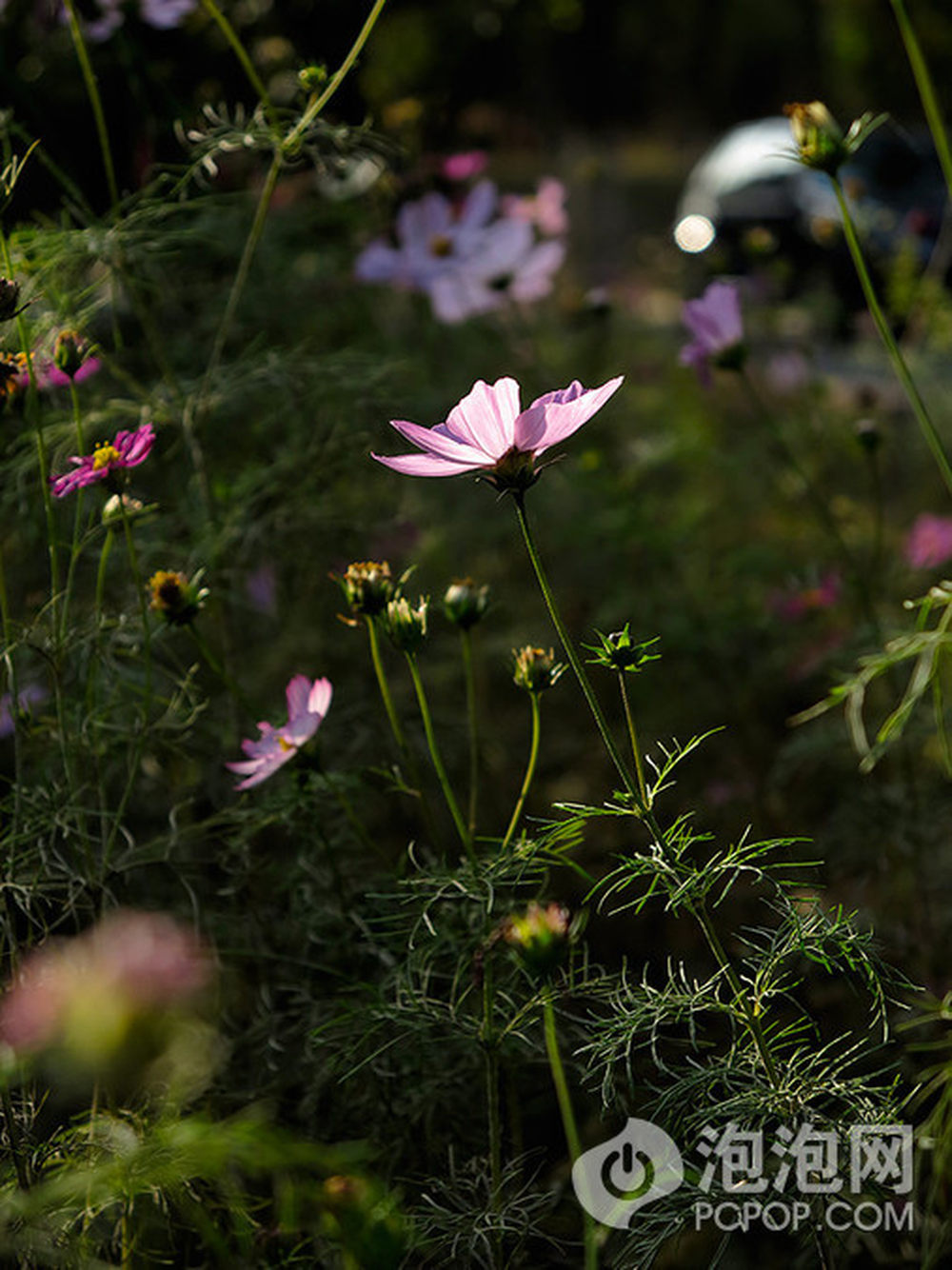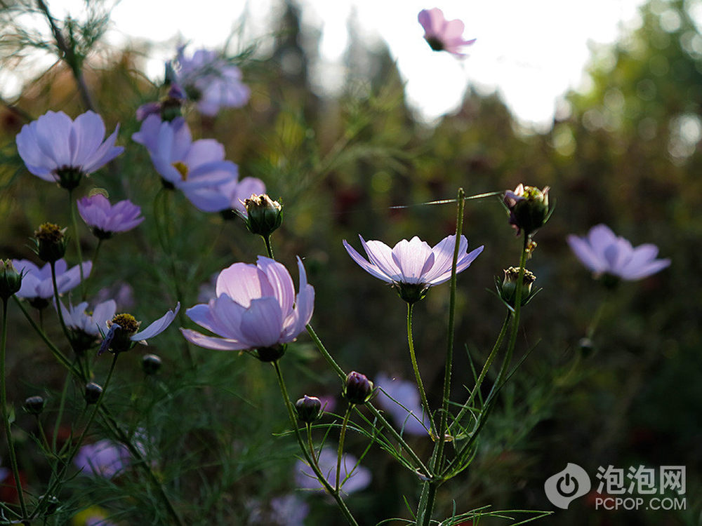 又见波斯菊,阳光透过树叶照在波斯菊上,显得纯洁而通透。