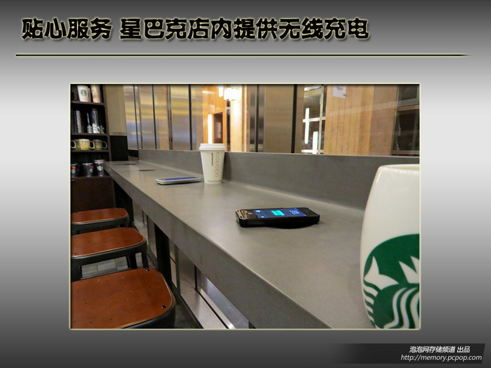 星巴克采用的是来自powermat公司的技术,将充电终端安装到桌子上,点一杯自己喜欢的咖啡,坐在座位上,借助无线充电和一部最新支持无线充电的智能手机,只要你愿意,基本可以泡一天星巴克了。