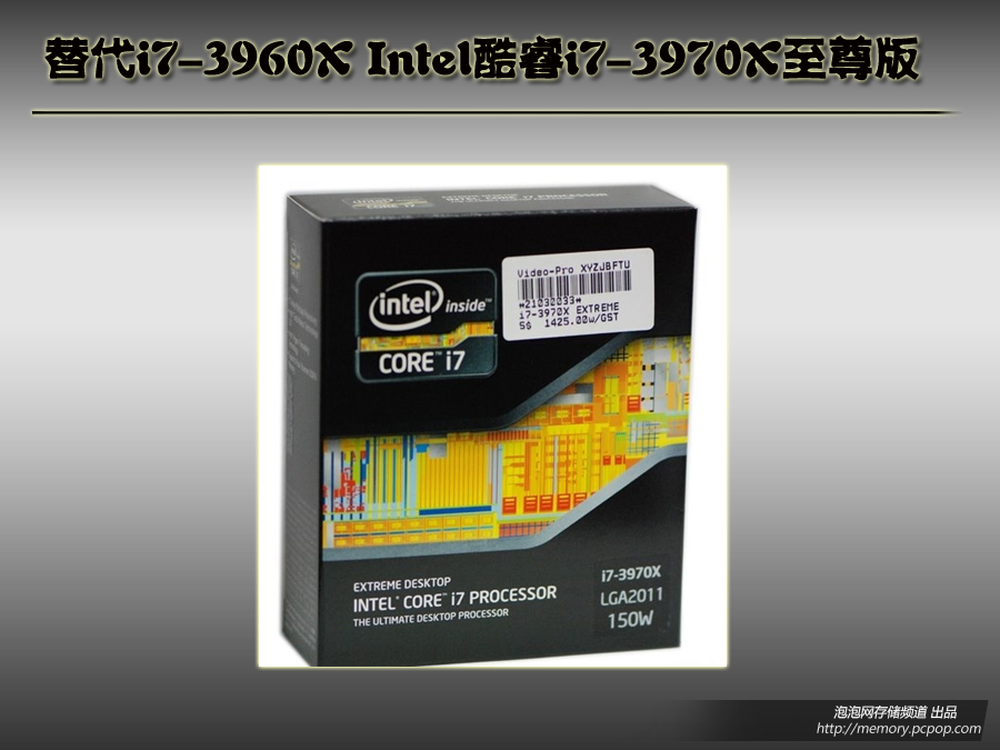 酷睿i7-3970X Extreme为黑盒版,性能处于Sandy Bridge-E架构产品的顶端,使用LGA2011接口封装,默认主频3.5GHz,支持英特尔Turbo Boost睿频至4.00GHz,6核心12线程,256KB L2高速缓存,每个核心共享15MB 三级缓存,集成四通道DDR3内存控制器,支持容量最高128GB,主要搭配英特尔X79芯片主板使用。其额定功率为150W,高于目前的i7-3960x的130W水平。