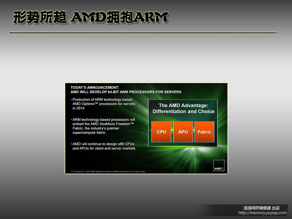 首款ARM架构的AMD Opteron处理器计划在2014年投产,仍将披挂Opteron皓龙品牌。这种64位的多核心SoC会针对数据中心中份额最大的密集型高能效服务器进行优化,提供现代计算体验,并整合收购而来的SeaMicro Freedom超级计算光纤互联技术。