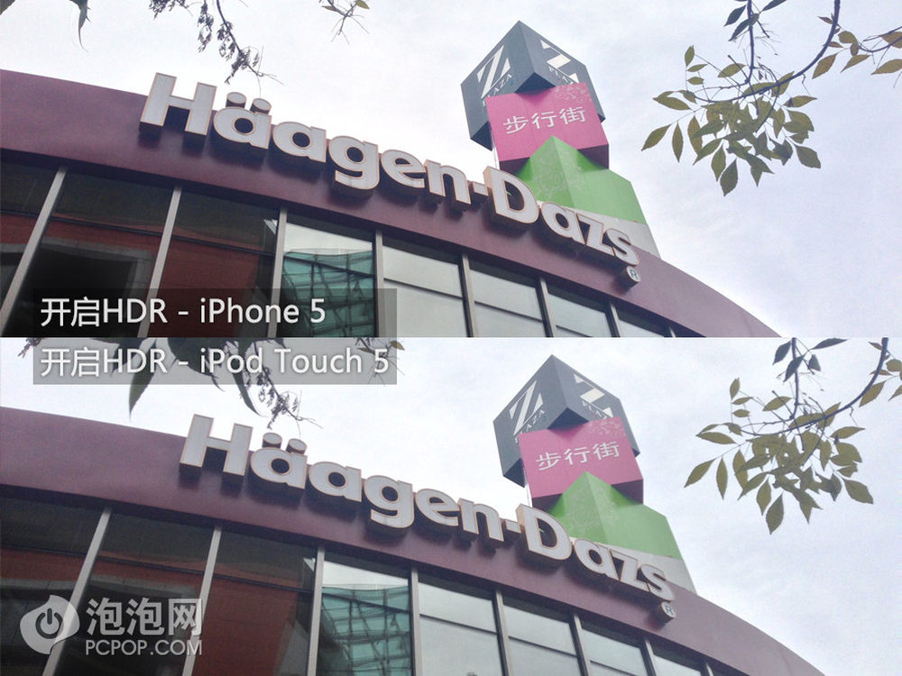 开启HDR后画面明显更亮一些,这一点在Touch上体现的更明显,iPhone 5在有颜色的地方比Touch稍艳。