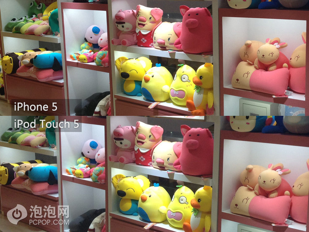室内光线充足色彩复杂的环境依然难不住苹果的这两只“5”,不仔细看基本发现不了两部设备的差异,仔细看,iPhone 5的成像依然更加艳丽一些,不过这几轮下来,可以明确一点:500万像素的iPod Touch 5在明亮的环境中与iPhone 5的成像差异非常的不明显。