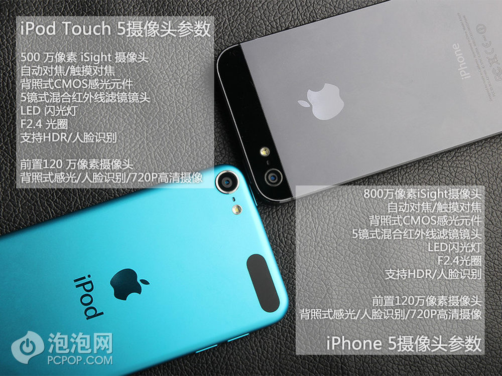 iPhone 5的摄像头为800万像素,能输出分辨率2448*3264的照片;iPod Touch 5为500万像素,能输出1936*2592的照片。