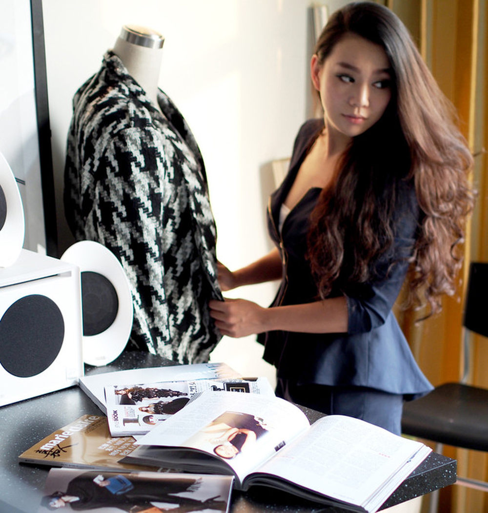 音乐是她设计的灵感源泉。当要寻找设计灵感的时候,她总喜欢打开麦博FC50,品味着音乐而展开构思。从麦博FC50流淌出奥多维科.艾迪的钢琴曲《Nuvole bianche》的轻柔之音,使她联想到柔美线形美设计;苏菲?蜜儿的爵士曲《Like Someone In Love》让她进入华丽性感唯美的设计风;格顿戴安娜的舞曲《Still getting younger》带给她年轻活力,时尚动感的设计理念。5/10